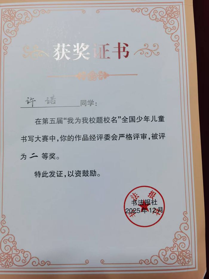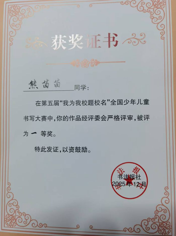 书法报讯 (记者 胡思玥)2025年12月8日,由书法报社主办,《书法报·书画教育》编辑部承办的第五届“我为我校题校名”全国少年儿童书写大赛评审揭晓。