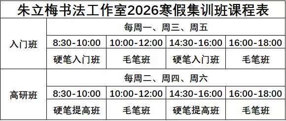 2026年寒假书法培训班课程表(与2025年寒假书法班课程表一样):