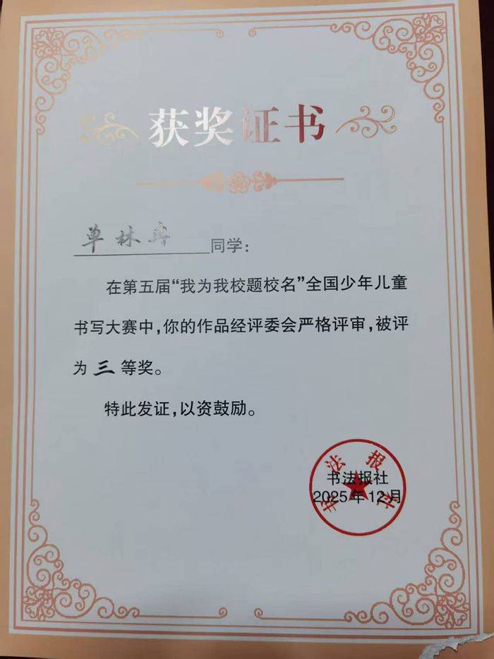 书法报讯 (记者 胡思玥)2025年12月8日,由书法报社主办,《书法报·书画教育》编辑部承办的第五届“我为我校题校名”全国少年儿童书写大赛评审揭晓。